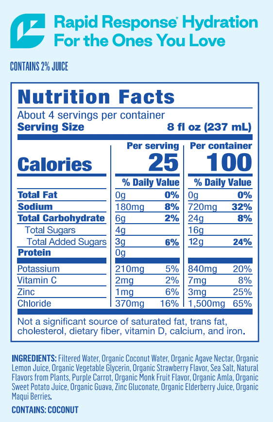 Filtered Water, Organic Coconut Water, Organic Agave Nectar, Organic Lemon Juice, Organic Vegetable Glycerin, Organic Strawberry Flavor, Sea Salt, Natural Flavors from Plants, Purple Carrot, Organic Monk Fruit Flavor, Organic Amla, Organic Sweet Potato Juice, Organic Guava, Zinc Gluconate, Organic Elderberry Juice, Organic Maqui Berries. CONTAINS: COCONUT
